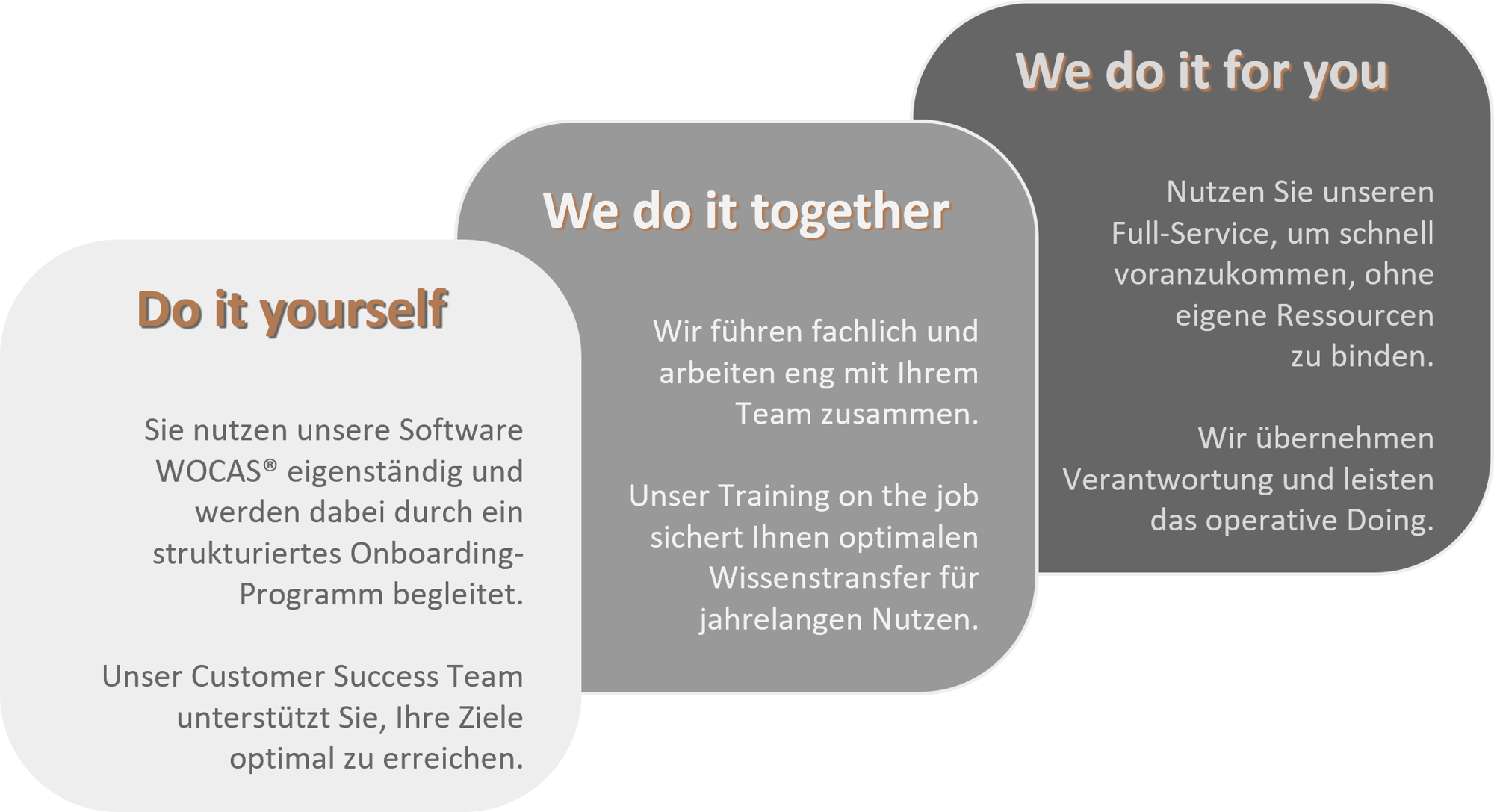 Zur optimalen Unterstützung unseres become frictionless Ansatzes haben wir unsere Erfahrungen über die Jahre in die Entwicklung unserer SaaS-Lösung WOCAS® einfließen lassen. Unsere Software unterstützt heute als Workflow-, Kommunikations- und Analysetool perfekt den gesamten Prozess.