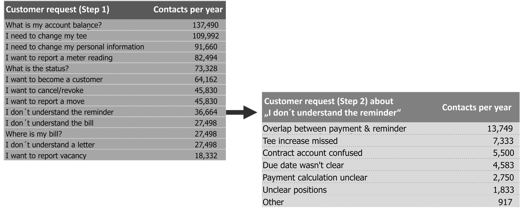 The quantified contact structure can be used to determine the number of contacts for "I don't understand the dunning". With the number of dunnings sent, provided by the finance department, the current contact rate can be easily determined and a target value derived from this. The breakdown of the customer intent at the second level then results in concrete and feasible approaches and fields of action for achieving the target.